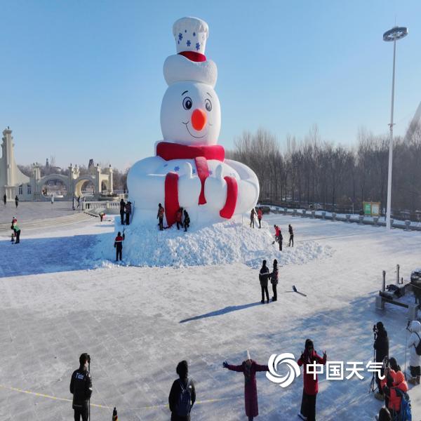 中国天气网讯 近日,哈尔滨太阳岛雪博会的第一座大型雪塑“雪人先生”已经完工,...