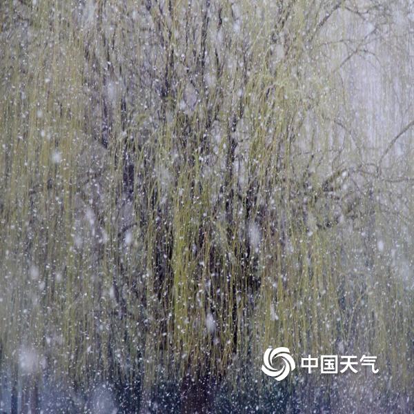 山东威海鹅毛大雪漫天飞舞 绿柳染白雪冬春难分辨