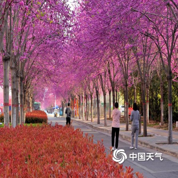 3月25日,河南汝州市区风和日丽,紫荆大道两旁的紫荆花竞相绽放,一路繁花似锦,春色醉人。