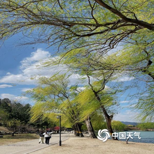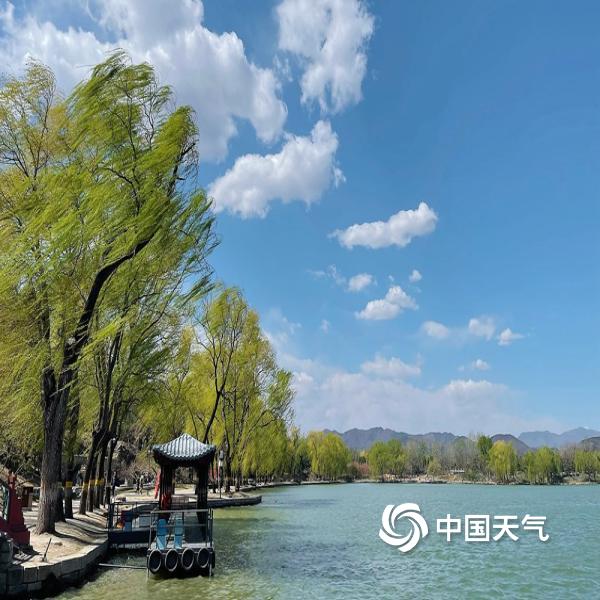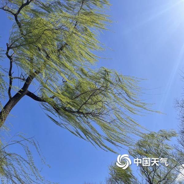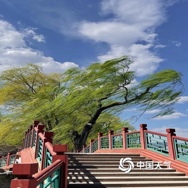 中国天气网讯 今天(4月1日),北京大风呼啸,柳枝随风摆动。天空中的白云随风...