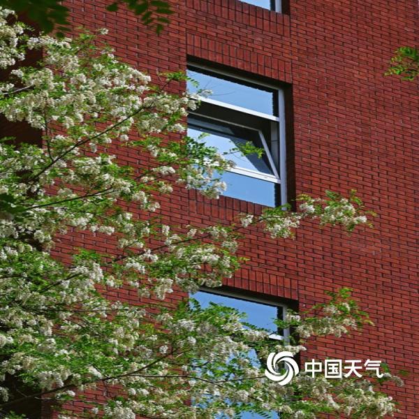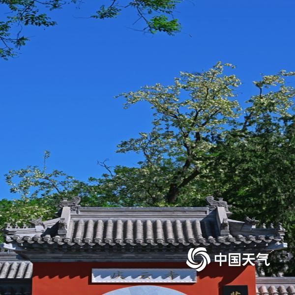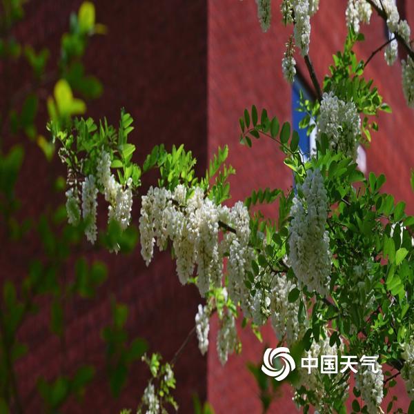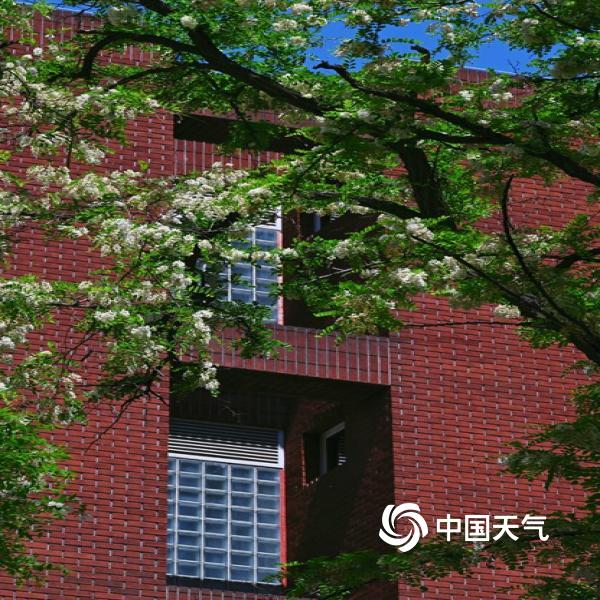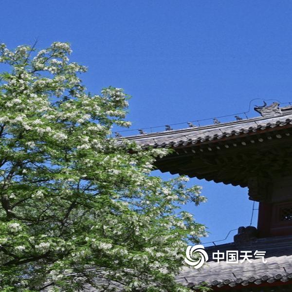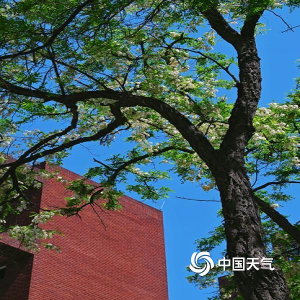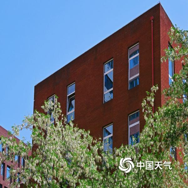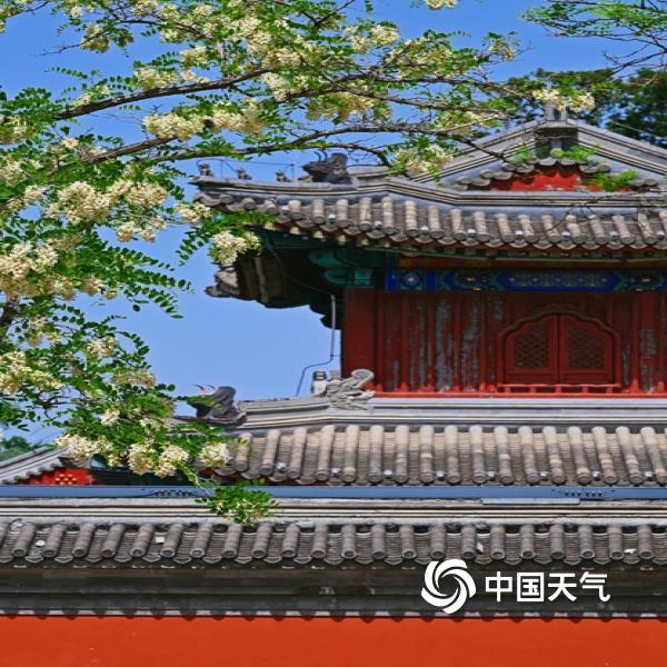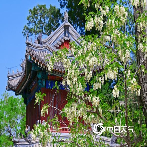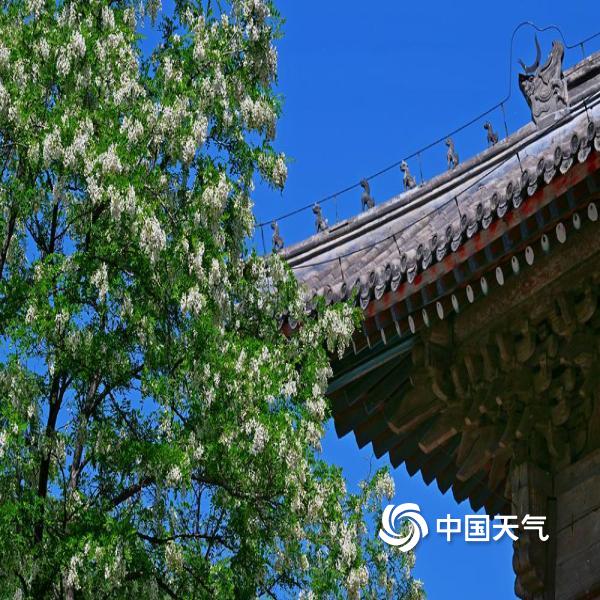 今天(4月25日),北京蓝天在线,洋槐花缀满枝头,在现代及古代建筑的映衬下,尽显春日柔美与浪漫。