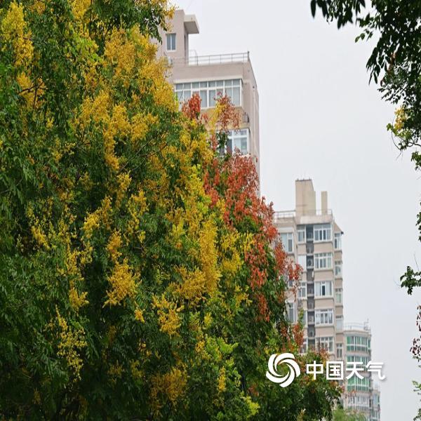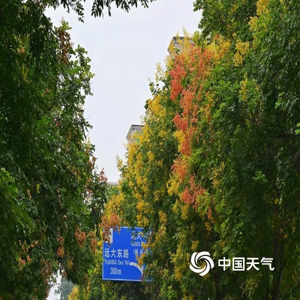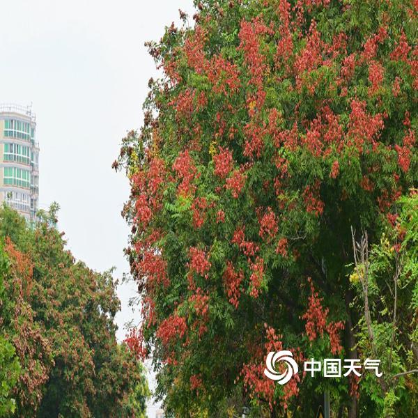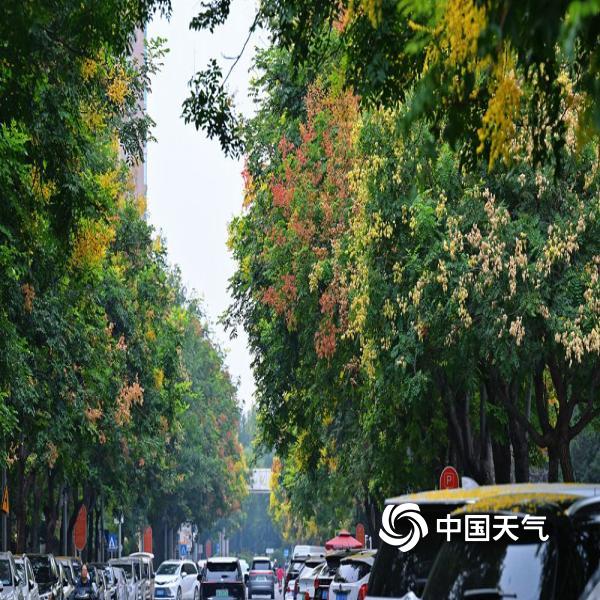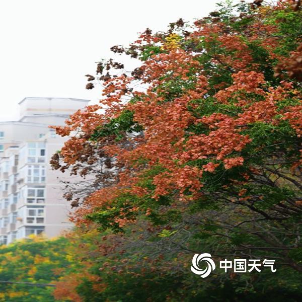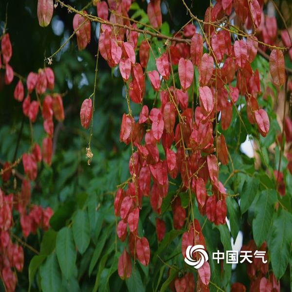 近日,北京街头的栾树开始变色,枝头挂满了红色的果实,与绿树、黄花相映,美不胜收。