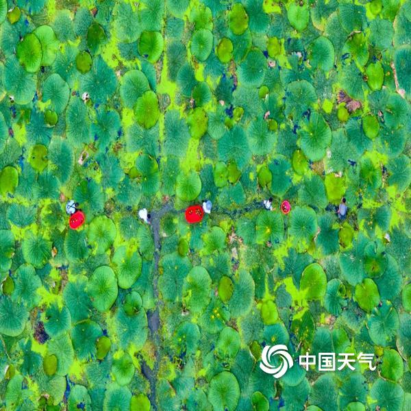 8月22日,江苏省靖江市东兴镇惠圣村,农民在水塘采收芡实。(汤德宏/视觉中国...