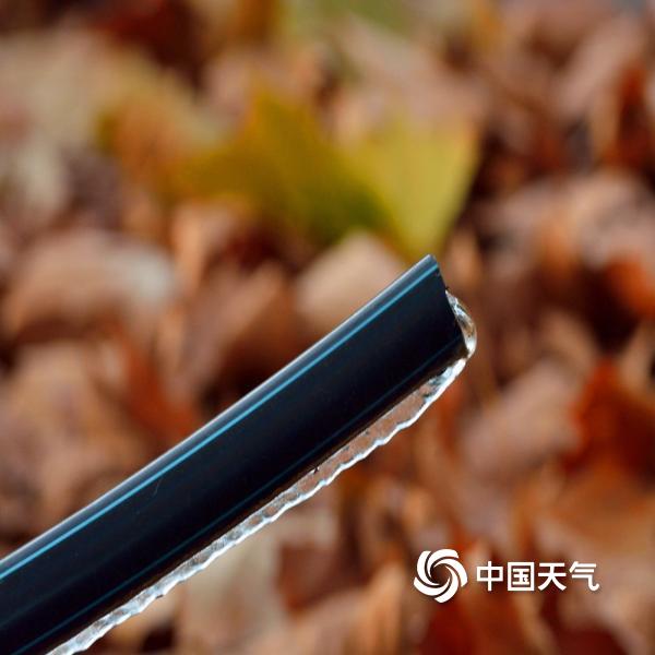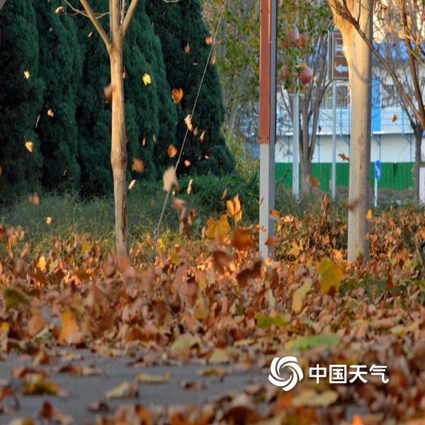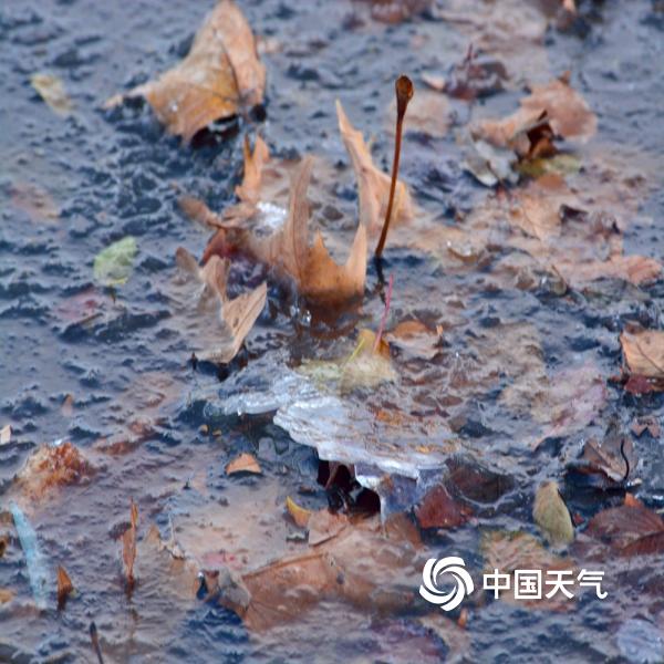 河南汝州现大风降温 风卷落叶寒凝冰生