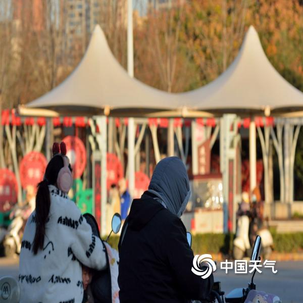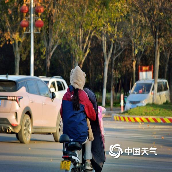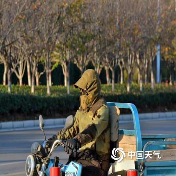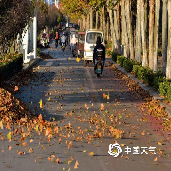 今天(11月18日)早晨,河南汝州市区风力强劲,自行车被吹倒,落叶遍地,部分地区出现结冰,市民包裹严实出行。