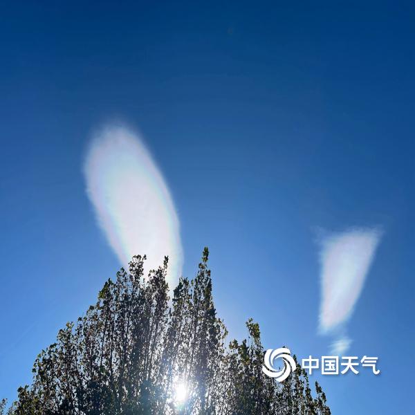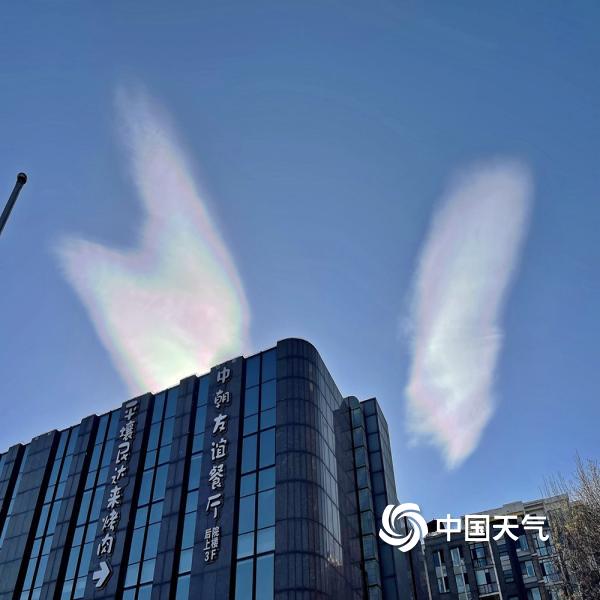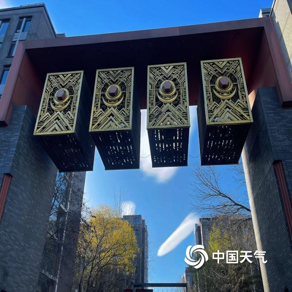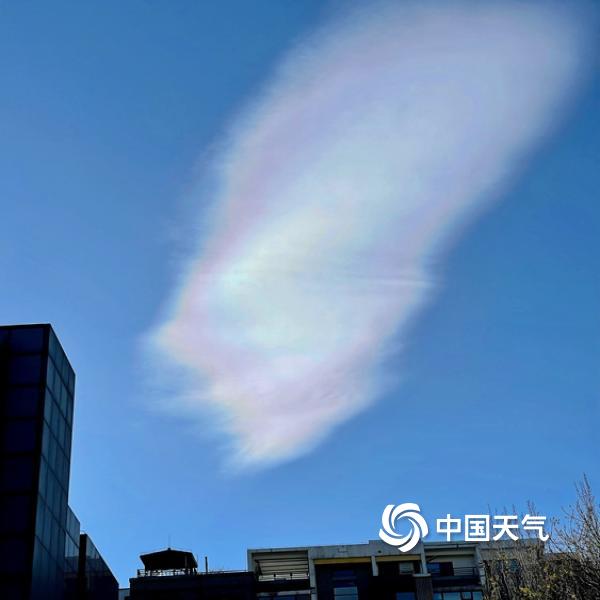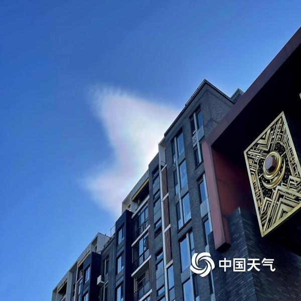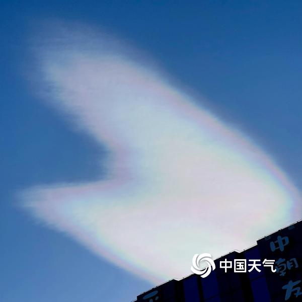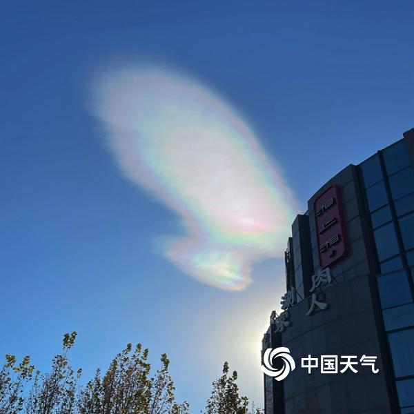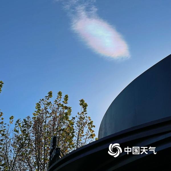 今天(11月27日),北京蓝天在线,阳光照耀下,一抹白云染上七彩色,呈现别样景观。