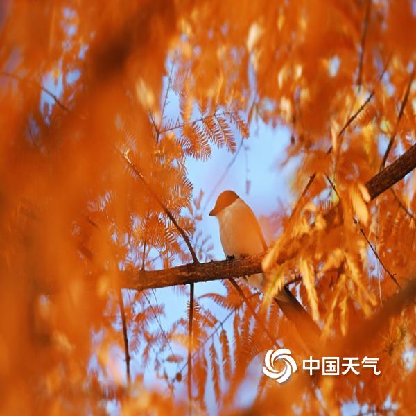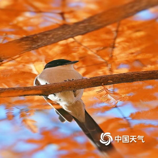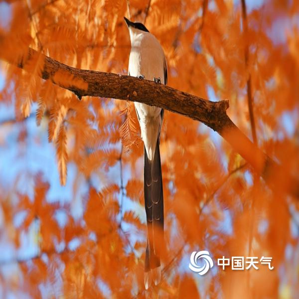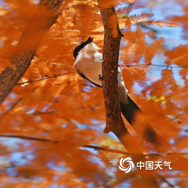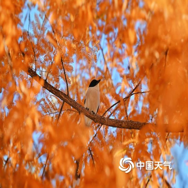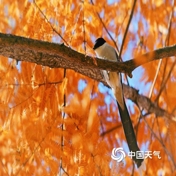今天(11月18日),北京蓝天在线,奥林匹克森林公园内水杉静立,喜鹊枝头添灵韵,一动一静皆成景。