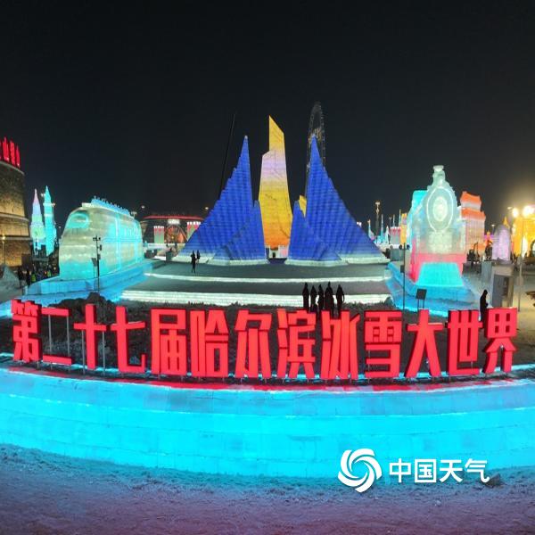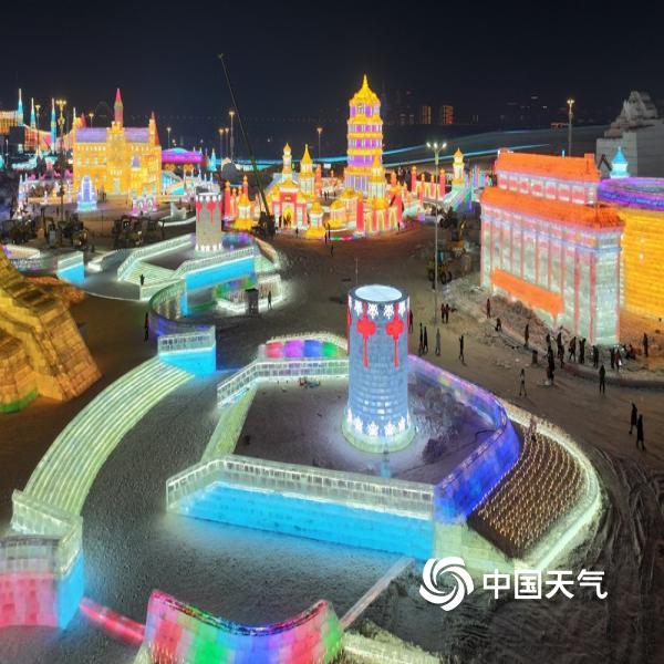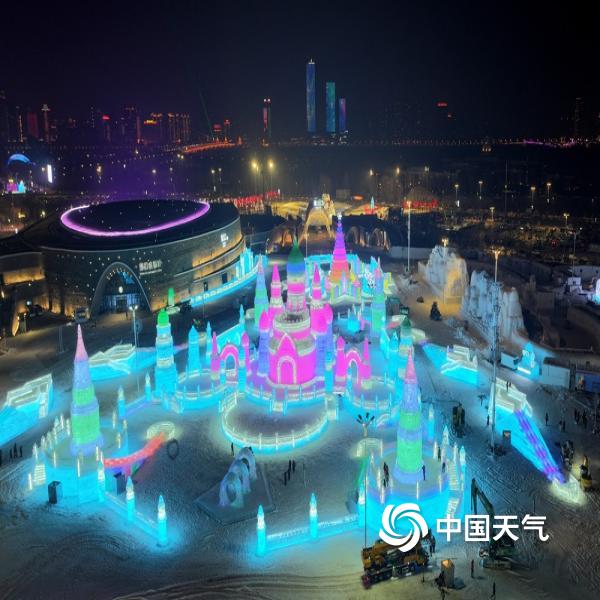中国天气网讯 12月14日晚,第二十七届哈尔滨冰雪大世界园区,冰雕雪塑基本完...
