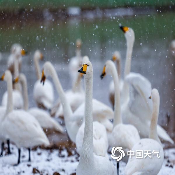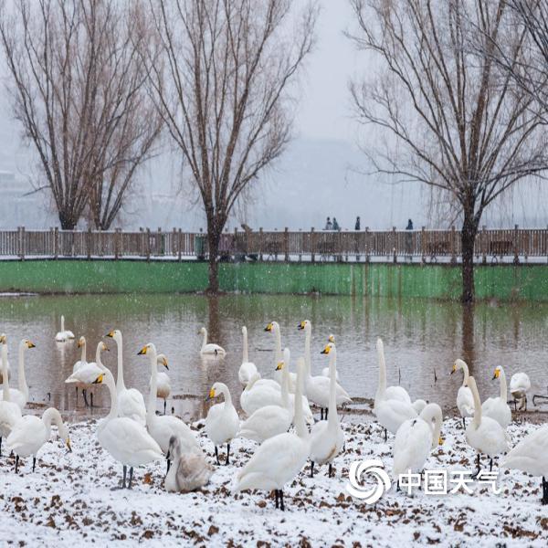 图为12月12日,山西平陆,黄河湿地雪纷飞,天鹅雪中漫步。(图/权永军)