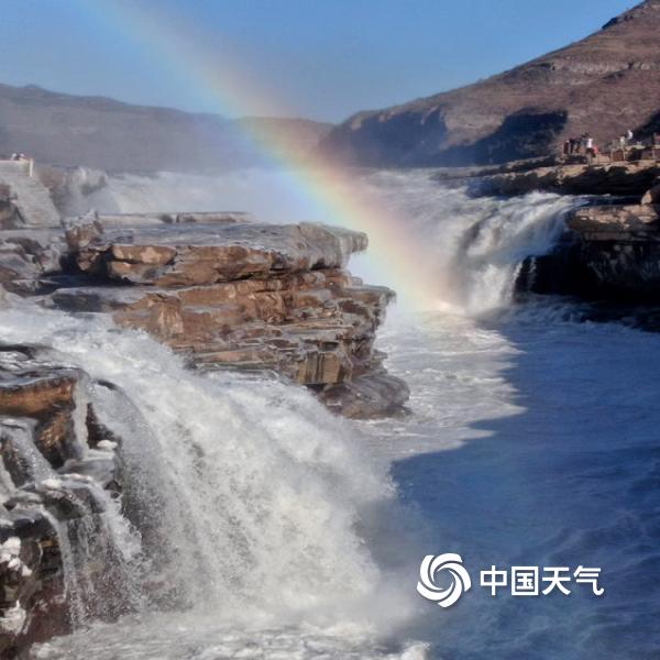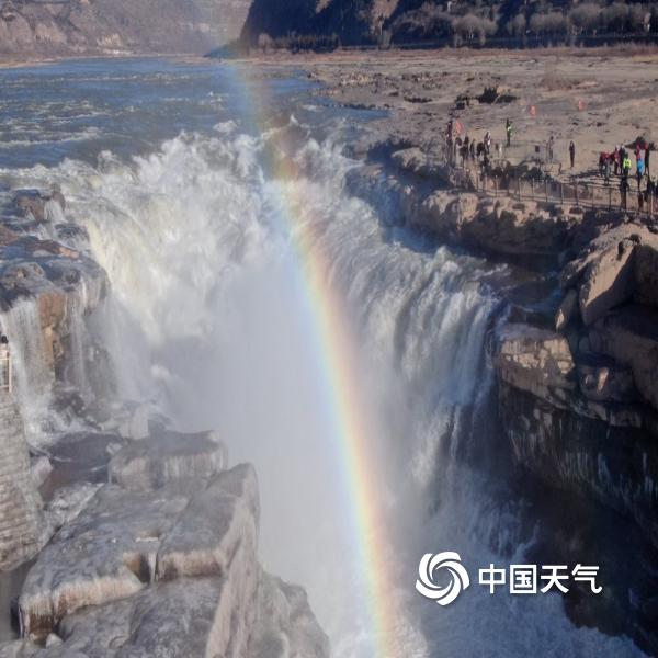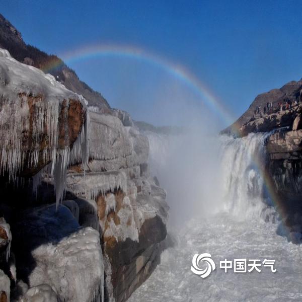 层层叠叠的冰挂与瀑布上空飞架的彩虹交相辉映,美不胜收。