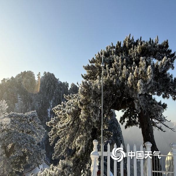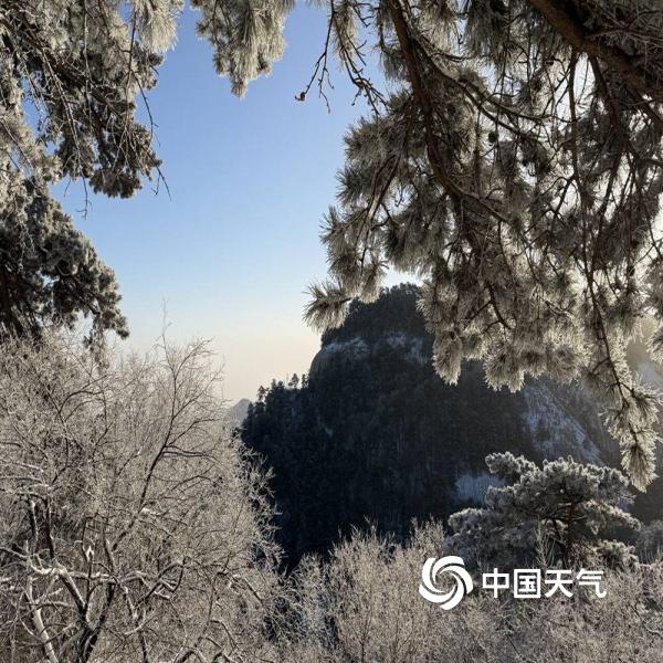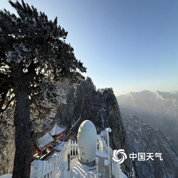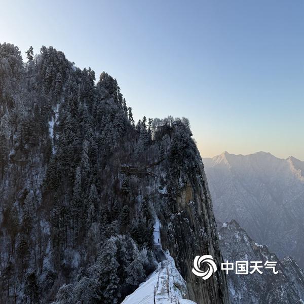 12月12日,西岳华山迎来一场降雪天气,树木、山脉到处都被积雪覆盖,变身洁白的冰雪世界。